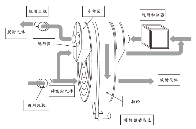 據(jù)介紹,分子篩吸附濃縮轉(zhuǎn)輪分為吸附區(qū)、脫附區(qū)、冷卻區(qū),轉(zhuǎn)輪在各個區(qū)域連續(xù)運轉(zhuǎn)。VOCs廢氣經(jīng)過濾裝置等預(yù)處理之后,進入轉(zhuǎn)輪吸附區(qū)被吸附凈化排除;吸附飽和后的分子篩進入脫附區(qū),經(jīng)高溫?zé)犸L(fēng)進行脫附濃縮;高溫脫附后的區(qū)域由冷空氣進行冷卻再生,用于冷卻的空氣經(jīng)加熱后可以作為再生空氣使用。