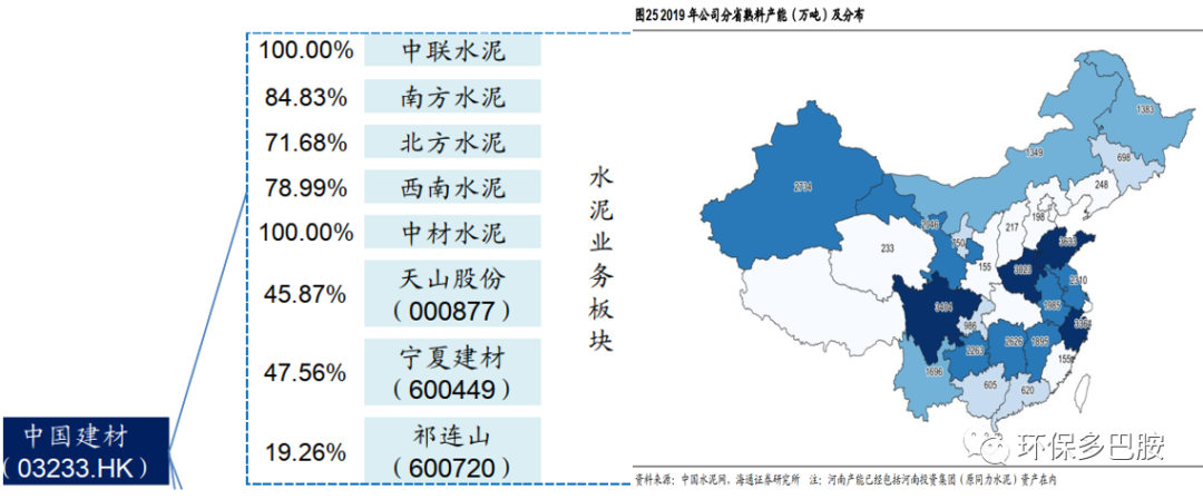 2019年海螺創(chuàng)業(yè)與水泥產(chǎn)能宇宙第一的中國建材(2019年公司水泥產(chǎn)能5.2億噸)成立合資公司:海建香港(股份各占50%,由海螺創(chuàng)業(yè)并表) ,并通過海建香港成立安徽海中環(huán)保開展業(yè)務(wù),全權(quán)負(fù)責(zé)投資、經(jīng)營及管理中國建材從事水泥相關(guān)業(yè)務(wù)的若干附屬公司現(xiàn)有及未來的固廢處置業(yè)務(wù),預(yù)計規(guī)劃處置總產(chǎn)能不少于 300 萬噸/年。