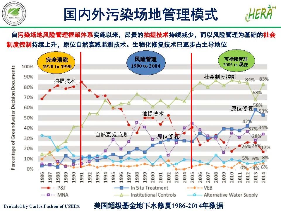 我國(guó)自污染場(chǎng)地風(fēng)險(xiǎn)管理框架體系實(shí)施以來(lái),昂貴的抽提技術(shù)持續(xù)減少,而以風(fēng)險(xiǎn)管理為基礎(chǔ)的社會(huì)制度控制持續(xù)上升,原位自然衰減監(jiān)測(cè)技術(shù),生物化修復(fù)技術(shù)已逐步占主導(dǎo)地位。本文從專家視角綜述了場(chǎng)地土壤與地下水污染風(fēng)險(xiǎn)管控技術(shù)。