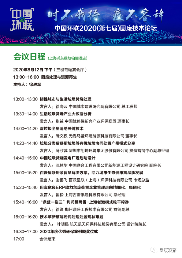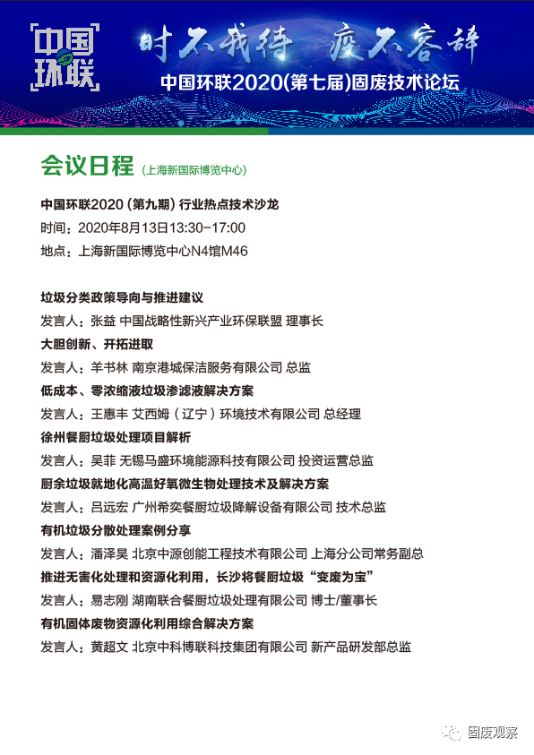 中國環(huán)聯(lián)2020(第七屆)固廢技術(shù)論壇定于2020年8月12-13日在上海市與第二十一屆中國環(huán)博會(2020年8月13-15日)背靠背召開。論壇將聚焦“疫情影響下垃圾焚燒處理潛在市場”、“垃圾分類新政策下行業(yè)特點”、“餐廚垃圾處理市場與短板”、“建筑垃圾資源化”、“固廢法修訂帶來行業(yè)新機(jī)遇”等熱點話題。我們邀請到常紀(jì)文、徐海云、劉建國、何品晶、張益、黃小山、徐進(jìn)軍等資深專家,以及在垃圾分類、環(huán)衛(wèi)管理、固廢處理、無廢城市等領(lǐng)域的卓越企業(yè)老總等,一起解讀最新政策與行業(yè)機(jī)遇、分析市場趨勢與技術(shù)焦點、分享創(chuàng)新模式與經(jīng)營理念,共同為“后疫情時代”的環(huán)境衛(wèi)生與生態(tài)環(huán)境建設(shè)獻(xiàn)計獻(xiàn)策。