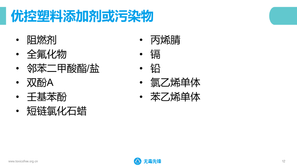 我們可以有一個(gè)抓手,抓重點(diǎn)。就是我們優(yōu)先關(guān)注這11種有毒塑料添加劑,同時(shí)這些有毒化學(xué)物質(zhì)最終還是會(huì)體現(xiàn)在產(chǎn)品當(dāng)中的,那也會(huì)有一個(gè)優(yōu)控產(chǎn)品名錄。當(dāng)我們進(jìn)行產(chǎn)品去毒和控制管理時(shí),也就相當(dāng)于把有毒的化學(xué)物質(zhì)進(jìn)行控制。