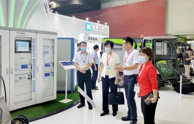 盈峰環(huán)境執(zhí)行副總裁鄒淑峰向廣東省住房和城鄉(xiāng)建設(shè)廳副廳長(zhǎng)劉瑋、廣東省環(huán)境衛(wèi)生協(xié)會(huì)會(huì)長(zhǎng)陳善坤詳細(xì)介紹環(huán)境監(jiān)測(cè)設(shè)備