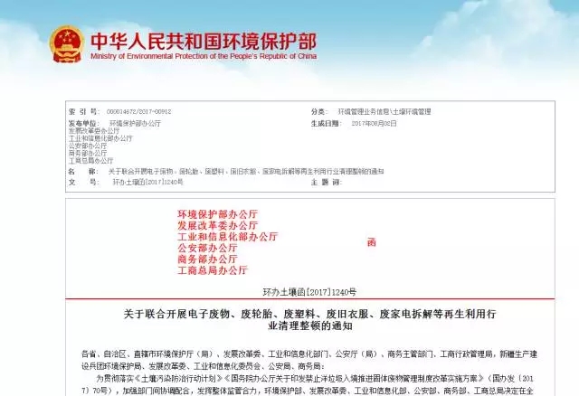 為貫徹落實(shí)《土壤污染防治行動計(jì)劃》《國務(wù)院辦公廳關(guān)于印發(fā)禁止洋垃圾入境推進(jìn)固體廢物管理制度改革實(shí)施方案》(國辦發(fā)〔2017〕70號),環(huán)境保護(hù)部聯(lián)合發(fā)展改革委、工業(yè)和信息化部、公安部、商務(wù)部、工商總局開展電子廢物、廢輪胎、廢塑料、廢舊衣服、廢家電拆解等再生利用行業(yè)清理整頓。