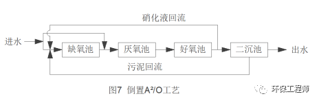 與常規(guī)的A2/O工藝相比,倒置A2/O工藝(見圖7)從前往后以此為缺氧-厭氧-好氧,該工藝的設(shè)計(jì)初衷是為了降低污泥回流中硝態(tài)氮對厭氧釋磷的影響,特別是對于高氨氮廢水污泥回流中攜帶有大量的硝氮,抑制厭氧釋磷反應(yīng)。同時(shí),為了解決碳源分配的問題,采用兩點(diǎn)進(jìn)水的方式來提供厭氧釋磷中有機(jī)物的消耗。