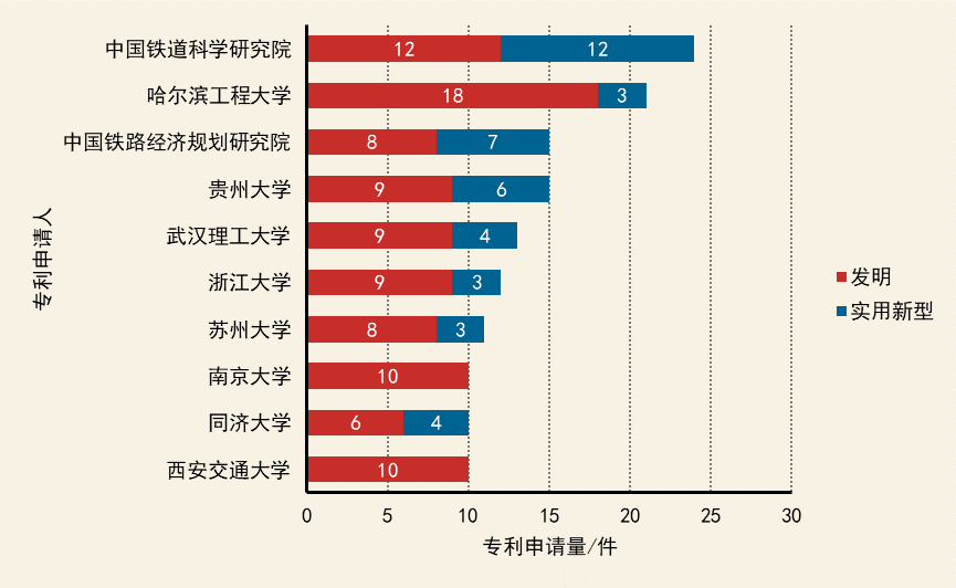 中國國內(nèi)院校在該技術(shù)領(lǐng)域的專利申請量偏少。排在前三位的高校/科研院所分別是中國鐵道科學(xué)研究院、哈爾濱工程大學(xué)、中國鐵路經(jīng)濟規(guī)劃研究院。