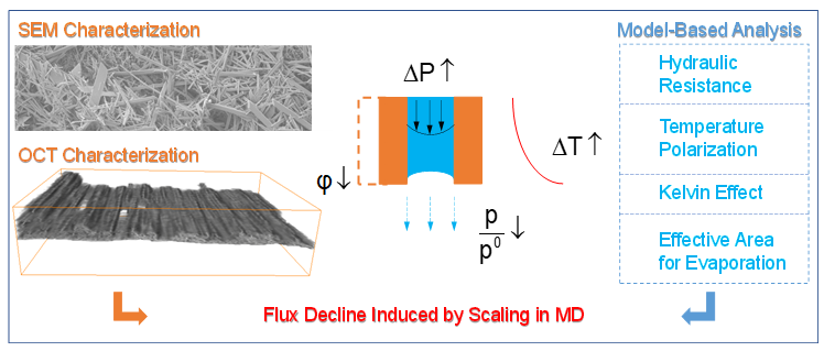 作為新型膜分離技術(shù)的代表之一,膜蒸餾在處理高濃度鹵水和苦咸水中具有獨特優(yōu)勢。然而,微溶無機鹽在膜蒸餾過程中結(jié)晶并形成結(jié)垢層是制約該技術(shù)發(fā)展的難題之一;尤其以硫酸鈣為代表的非堿性微溶鹽,目前仍缺乏有效的解決方法,其相關(guān)機理的研究對推動膜蒸餾技術(shù)的應(yīng)用具有重要意義。結(jié)垢的發(fā)生不但會造成通量的下降,還會對分離膜產(chǎn)生不可逆的損傷。由于表征技術(shù)的相對欠缺,膜蒸餾過程中結(jié)垢現(xiàn)象發(fā)生和演化的機理仍未被充分解析。