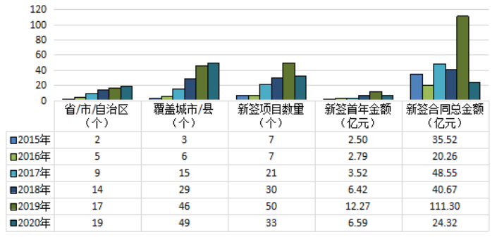 2020年,龍馬環(huán)衛(wèi)新增中標環(huán)衛(wèi)服務(wù)項目 33 個,新簽合同年化金額 6.59 億元,同比下降 46.29%,新簽合同總金額 24.32 億元,同比下降 78.15%。