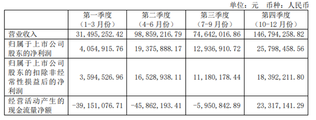 綜合分季度主要財務(wù)數(shù)據(jù)(圖2)來看,第一季度較為穩(wěn)定,收入是3149.5萬元;第二季度收入逐漸樂觀,達到了9885.9萬元;第三季度有些許下降,收入為7464.2萬元;第四季度收入明顯增長,達到了1.47億元,且凈利潤和現(xiàn)金流動凈額都有大幅的增長。