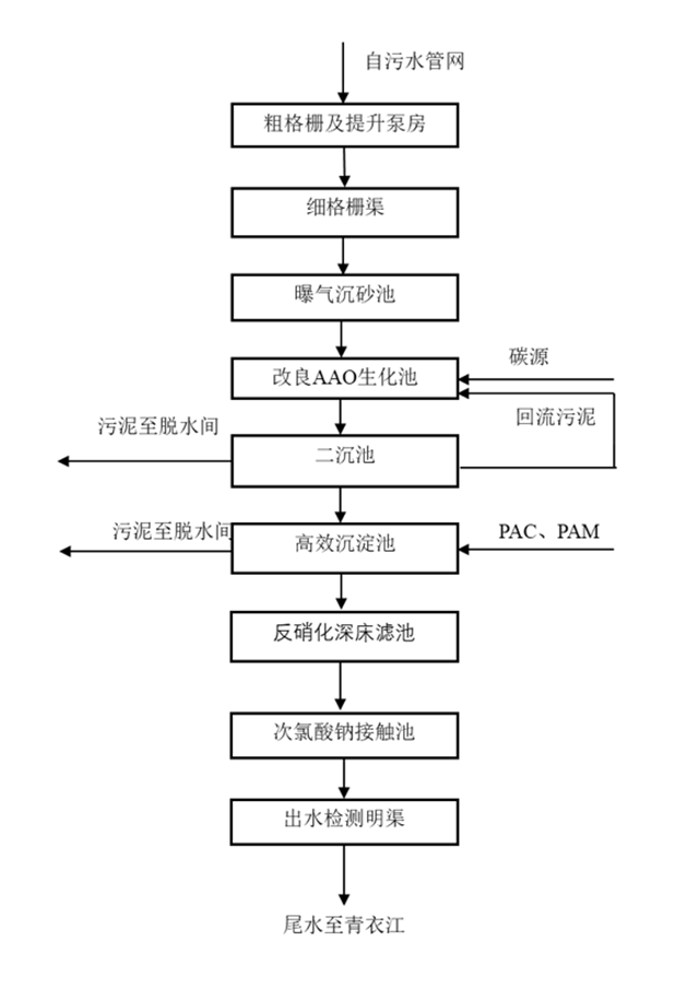 (1)外部市政管網(wǎng)來水+采用粗格柵+提升泵站+細格柵+曝氣沉砂池+A2/O+二沉池+高效沉淀池+反硝化深床濾池+接觸消毒池工藝。