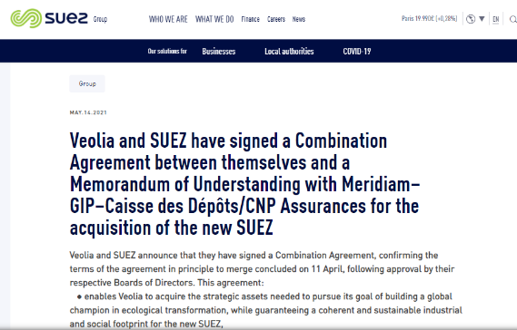 4月12日,事件出現(xiàn)了重要轉(zhuǎn)折——威立雅和蘇伊士宣布,昨晚各自的董事會原則上就兩集團(tuán)合并的主要條款和條件達(dá)成協(xié)議。兩家公司以每股Suez股份20.50歐元的價格(附息票)為條件達(dá)成協(xié)議,該交易的銷售額約為370億歐元。