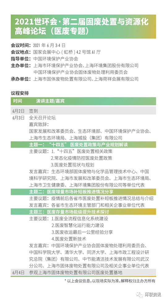 為持續(xù)完善醫(yī)療廢物處置機制、守好“末端”防線,助力全國醫(yī)療廢物處置補短板能力建設(shè),提升醫(yī)廢收運處置能力與水平,推進《醫(yī)療廢物處理處置污染控制標(biāo)準(zhǔn)》的貫徹實施,2021年6月2日-3日將在上海舉辦“2021世環(huán)會·第二屆固廢處置與資源化高峰論壇(醫(yī)廢專題)”。