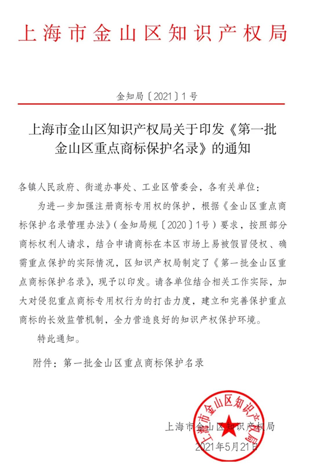 為進一步加強注冊商標專用權的保護,根據《上海市金山區(qū)重點商標保護名錄管理辦法》(金知局規(guī)〔2021〕1號)要求,上海市金山區(qū)知識產權局領導經過數月評審討論,結合申請商標在市場上易被假冒侵權、確需重點保護的實際情況,于近日頒布《第一批金山區(qū)重點商標保護名錄》,上海江浪科技股份有限公司成功入圍,企業(yè)實力再獲權威認證!