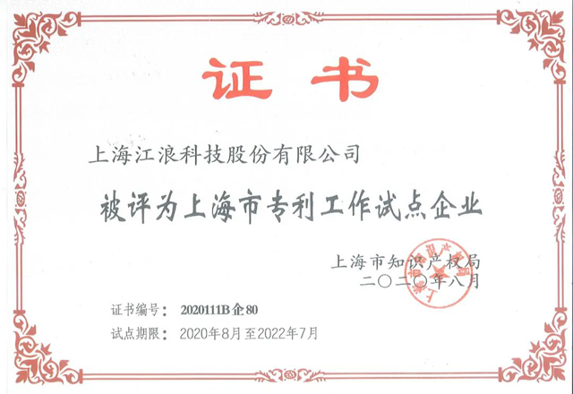 “上海市專利工作試點企業(yè)”是江浪科技繼獲評“上海市高新技術企業(yè)”、“上海市專精特新企業(yè)”之后獲得的又一項榮譽。