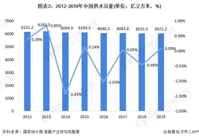 我國供水總量在2013年達到峰值后開始緩慢下降,近幾年,全國供水總量保持基本穩(wěn)定,平均年變化幅度保持在±1%左右。2019年我國供水總量為6021.2億立方米,同比增加0.09%,我國供水市場已趨近飽和,進入平穩(wěn)發(fā)展狀態(tài)。