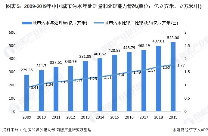 除了供水外,污水處理也是目前水務行業(yè)重點關注的領域之一。從污水處理的供給來看,由于城鎮(zhèn)化和經(jīng)濟發(fā)展需求,中國城市近年來污水產(chǎn)生量和處理量呈上升趨勢。從城市污水處理情況來看,截至2019年底,全國城市污水處理廠處理能力1.77億立方米/日,累計處理污水量523億立方米。