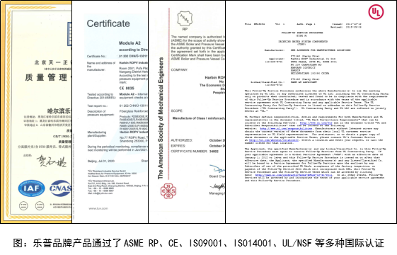 接下來的幾年,除通過ASME RP認(rèn)證外,樂普認(rèn)證部門和研發(fā)部門牽頭,與其他部門共同持續(xù)發(fā)力,樂普企業(yè)及產(chǎn)品先后通過了ISO9001、CE、UL(NSF 61)、CNAS、ACS、WRAS等認(rèn)證,并建立了GB/T19001、GB/T24001、GB/T28001一體化管理體系,成為了國內(nèi)膜外殼行業(yè)中更多被第三方機(jī)構(gòu)認(rèn)可的品牌,也為樂普的國際化發(fā)展鋪設(shè)了道路。