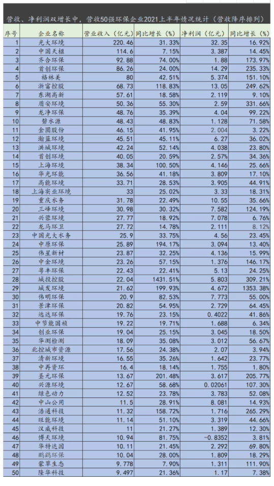 2021年上半年?duì)I收、凈利潤雙增的企業(yè)中,營收排在前50的企業(yè),光大環(huán)境、中國天楹、齊合環(huán)保、首創(chuàng)環(huán)保、格林美5家企業(yè),半年?duì)I收均超80億元,分別以上半年?duì)I收實(shí)現(xiàn)220.46億元、114.6億元、92.88億元、86.26億元、80億元的成績穩(wěn)居前五。