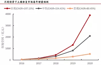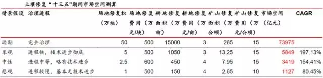 土壤修復(fù)十三五市場空間1100億-5900億,遠期市場總量在7.4萬億元左右。在中性情景下,十三五市場空間總量約3400億。