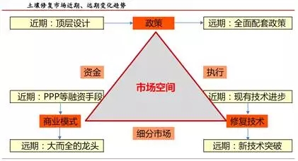 政策層面。長期尺度下,政策層面最值得期待的驅(qū)動因素是在土壤修復(fù)所有領(lǐng)域、全國大部分區(qū)域的配套性政策全面出臺。與短期尺度相比,長期尺度下政府必須向治理難度更大、經(jīng)濟效益更弱的修復(fù)任務(wù)“開刀”。