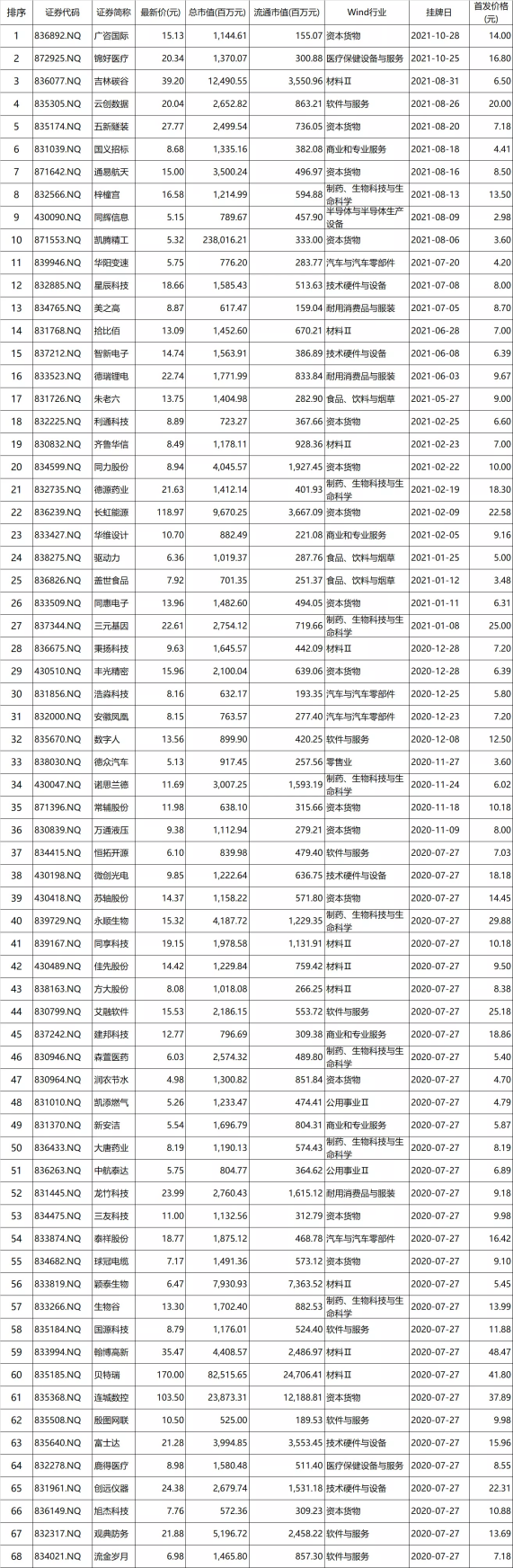 附:北交所首批68家精選層企業(yè)