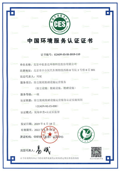 ▼中航泰達“中國環(huán)境服務(wù)認證證書”