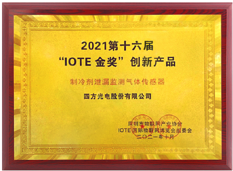 2021年10月,由中國物聯(lián)網(wǎng)產(chǎn)業(yè)應用聯(lián)盟、深圳市物聯(lián)網(wǎng)產(chǎn)業(yè)協(xié)會主辦的IOTE2021第十六屆深圳國際物聯(lián)網(wǎng)博覽會上,四方光電自主研發(fā)的制冷劑泄漏監(jiān)測氣體傳感器從上萬件產(chǎn)品中脫穎而出,被評為IOTE2021金獎創(chuàng)新產(chǎn)品。
