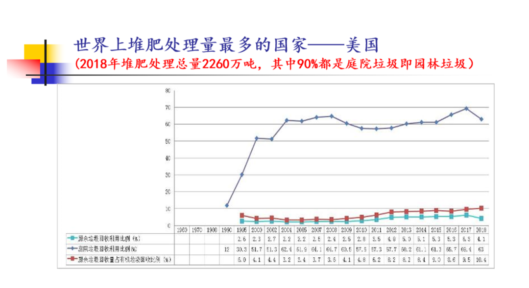 實(shí)際上,在全世界范圍內(nèi)比較,生活源、家庭源廚余垃圾及庭院垃圾(園林垃圾)堆肥利用量最大的國家是美國。美國在2018年垃圾堆肥處理總量達(dá)到2260萬噸,其中90%都是園林垃圾。