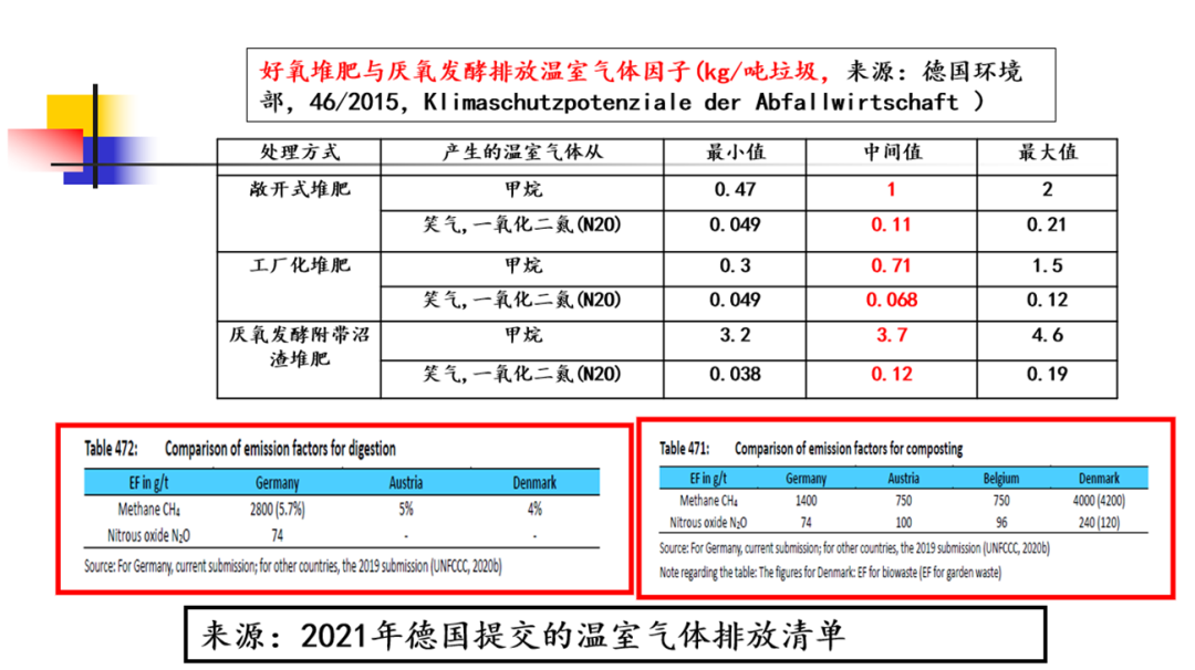 從歐盟提交給聯(lián)合國的數(shù)據(jù)來看,厭氧消化實(shí)際是增加溫室氣體的排放。歐洲的專家既然了解這個(gè)現(xiàn)實(shí),為何還要到包括中國在內(nèi)的發(fā)展中國家來建議要做有機(jī)垃圾的厭氧或堆肥呢?其實(shí)背后也有更深層次的原因,一方面發(fā)展中國家財(cái)政實(shí)力相對(duì)較弱,難以普遍負(fù)擔(dān)高成本的垃圾焚燒發(fā)電。而另一方面在降污和減碳的雙重壓力下又切實(shí)需要減少有機(jī)垃圾的直接填埋。在這種復(fù)雜情況下,將有機(jī)垃圾分出一部分做厭氧或堆肥,實(shí)際還是能夠達(dá)到一定減排的效果。下圖中展示的是德國提交的溫室氣體排放清單中厭氧或堆肥工藝過程中,一噸有機(jī)垃圾處理排放的二氧化碳當(dāng)量。