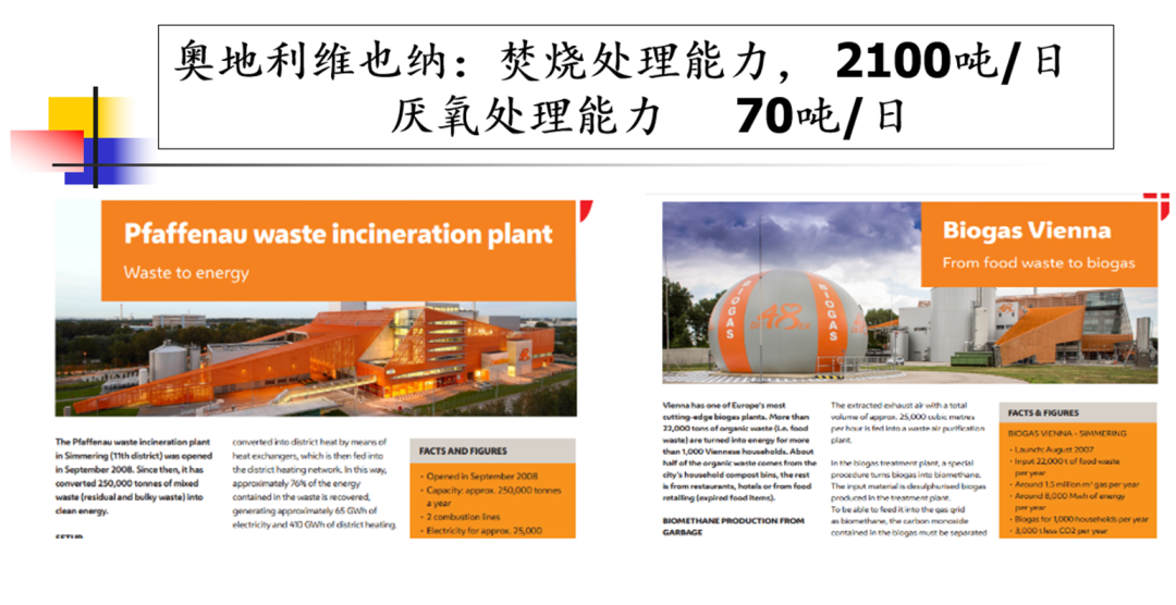 上圖是奧地利維也納的一個(gè)垃圾焚燒發(fā)電廠??梢钥吹皆摲贌龔S的一端有一個(gè)厭氧消化裝置,這個(gè)厭氧裝置主要處理從家庭分出來的廚余垃圾。我國的垃圾焚燒發(fā)電廠都有滲濾液處理裝置,且配置的比例遠(yuǎn)遠(yuǎn)大于圖中焚燒發(fā)電廠。圖中焚燒發(fā)電廠的焚燒能力是2100噸/日,其對(duì)應(yīng)的厭氧處理能力僅是70噸/日。而國內(nèi)2100噸/日的垃圾焚燒發(fā)電廠配的厭氧規(guī)模以垃圾處理規(guī)模的20%計(jì)也超過400噸/日。