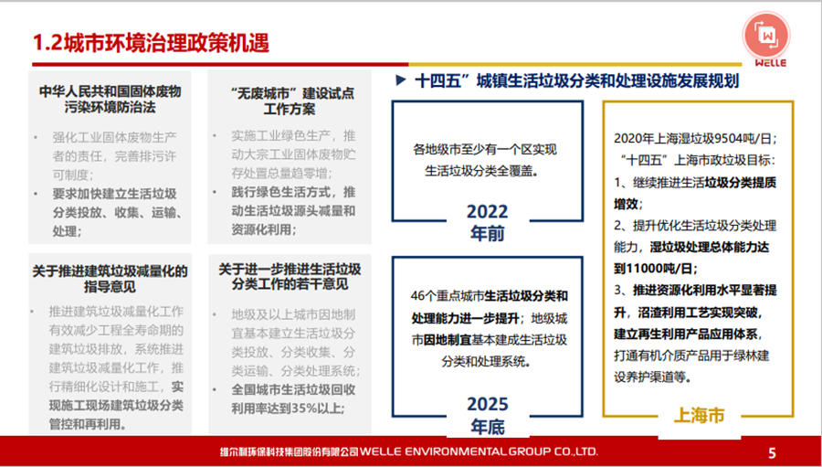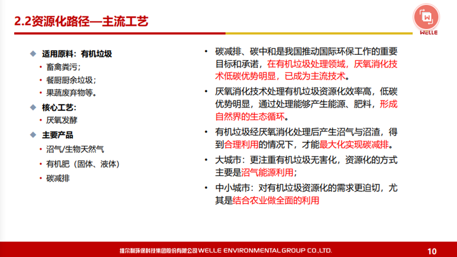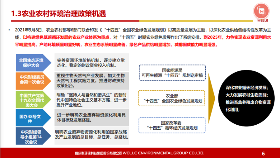 本文圍繞碳中和背景下的政策機遇、城鄉(xiāng)有機廢棄物資源化的的主要處理方法和路徑等內(nèi)容展開,同時對維爾利集團概況和發(fā)展歷程做了簡要回顧。 2021年10月20-21日,2021年中國沼氣學(xué)會學(xué)術(shù)年會暨中德沼氣合作論壇在南京舉行。作為2021年中國沼氣學(xué)會學(xué)術(shù)年會的承辦單位,維爾利環(huán)??萍技瘓F股份有限公司董事長李月中博士以《城鄉(xiāng)有機廢棄物資源化路徑探討》為主題,與大家一起探討了碳中和背景下城鄉(xiāng)有機廢棄物資源化的發(fā)展與未來。報告圍繞碳中和背景下的政策機遇、城鄉(xiāng)有機廢棄物資源化的的主要處理方法和路徑等內(nèi)容展開,同時對維爾利集團概況和發(fā)展歷程做了簡要回顧。本文根據(jù)其發(fā)言整理。▼維爾利環(huán)??萍技瘓F股份有限公司董事長 李月中各位領(lǐng)導(dǎo)、各位專家、各位同仁,大家上午好!今天有幸代表維爾利集團和大家做交流,作為會議的承辦方,也感謝中國沼氣學(xué)會、南京大學(xué)、德國沼氣協(xié)會給維爾利這個機會。維爾利作為專業(yè)的企業(yè),實際上歷史并不是很長,但是我們對沼氣和厭氧技術(shù)這塊有自己的獨到見解。作為一個商業(yè)機構(gòu),企業(yè)怎么能夠在競爭行業(yè)里生存和發(fā)展?在這里和大家做一些交流,和大家一起思考,同時希望在座的同仁能夠在這個行業(yè)相對比較困難的情況下抱團取暖。2020年9月,國家主席習近平在聯(lián)合國大會上提出“二氧化碳排放力爭于2030年前達到峰值,努力爭取2060年前實現(xiàn)碳中和”。2021年3月15日,習近平總書記主持召開中央財經(jīng)委員會第九次會議并發(fā)表重要講話強調(diào),要把碳達峰、碳中和納入生態(tài)文明建設(shè)整體布局,拿出抓鐵有痕的勁頭,如期實現(xiàn)2030年前碳達峰、2060年前碳中和的目標。從能源結(jié)構(gòu)上來說,有機垃圾資源化產(chǎn)生的生物質(zhì)能源在實現(xiàn)雙碳目標上具有獨特意義。這實際上也是倒推企業(yè)行業(yè)轉(zhuǎn)型。對大家來說,“碳達峰碳中和”既是一個挑戰(zhàn)也是一個機會。這里面包括了現(xiàn)在我們推出的對城市環(huán)境,對農(nóng)村農(nóng)業(yè)環(huán)境可能存在的機會,這些機會對環(huán)保產(chǎn)業(yè)來說,個人認為受到政策影響比較大。為什么德國2016年在農(nóng)業(yè)生物天然氣領(lǐng)域有下滑?是因為某些政策出現(xiàn)了不到位的情況,一些企業(yè)就不愿意去做。在碳達峰、碳減排的前提下,我們有很多的機會,但這個機會要真正落實,還是要國家從頂層設(shè)計到具體的政策到位,才能夠使這個行業(yè)有比較好的發(fā)展。在城市環(huán)境治理領(lǐng)域,城市有機廢棄物(垃圾量)非常大。上海實施垃圾分類以后,2020年上海濕垃圾的產(chǎn)生量是每天在9500-10000噸左右,也就是說1/3為濕垃圾。這對焚燒廠來說,是一個巨大的減負,但同時對處理能力也有了條件限制。我們深度參與了這方面工作,現(xiàn)在上海的處理能力大概為4000噸左右,意味著上海的濕垃圾處理能力還有60%在建,徹底實現(xiàn)垃圾分類的路還很遠。北京情況更為嚴重。原來北京只有幾個堆肥廠,原來只是三相做一點小的堆肥,如果真的要實現(xiàn)垃圾源頭分類,大概4、5千噸的垃圾處理設(shè)施要重新建設(shè)。在農(nóng)業(yè)農(nóng)村環(huán)境治理領(lǐng)域,包括農(nóng)產(chǎn)品加工這方面,整個市場規(guī)??赡芨?。各位前輩都已經(jīng)做了一些介紹,我們是不是能夠全部實現(xiàn)資源化處理,是值得商榷的。對于不同的原料,我們應(yīng)該怎么處理?作為企業(yè),我們推行起來還是有一定的難度。我們現(xiàn)在的這些大型的沼氣項目,它的源頭、原料、收益、收益成本,包括最終的產(chǎn)品出路,收集半徑到底多少是最合理的?實際上是需要根據(jù)不同有機廢棄物的種類以及最終產(chǎn)品的出路來規(guī)劃項目規(guī)模,而不是按照政策要求。比如一萬方的沼氣工程才稱得上大型沼氣項目,才有補貼,這樣的項目就不一定能夠真正地實現(xiàn)盈利。 下面大概講一講我們最近對城鄉(xiāng)有機廢棄物資源化的主要處理方法和路徑。