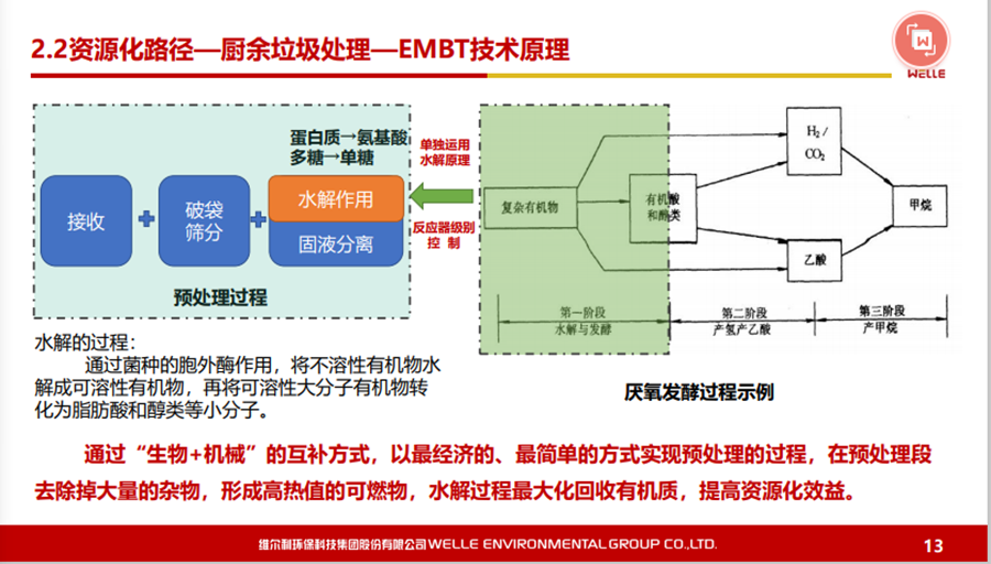 對于有機廢棄物的原料及核心技術(shù),可以說從城市有機廢棄物到農(nóng)村有機廢棄物,現(xiàn)在最核心的還是通過厭氧發(fā)酵技術(shù),最終通過沼氣化利用,達到無害化或者是環(huán)保化,再盡可能實現(xiàn)資源化。國家發(fā)改委推出了一百個餐廚垃圾處理試點項目,之后進行全方位地推出。在國內(nèi)真正運行好的餐廚垃圾項目并不是特別多,主要工藝還是以厭氧為主。為什么這塊資源化的效率會好一些?尤其在“碳減排”的壓力下,使得出口價格一直比較好,這個行業(yè)最近稍微能夠掙點錢。另外,更深度的資源化利用,比如做有機質(zhì),食用的昆蟲養(yǎng)殖,也會有一些收益,再加上沼氣的收益。對于餐廚垃圾處理,我認為如果到了一定規(guī)模,收益還是不錯的。相對來說,廚余垃圾的資源化利用效率會差一些?,F(xiàn)在全國都在推行垃圾分類,不同城市廚余垃圾的質(zhì)量相差比較大。如上海的廚余垃圾含水率、油脂含量與餐廚垃圾是有一點類似的,含油量可能稍微小一點,但在其他城市就相差非常大。廚余垃圾資源化是節(jié)省能源化的利用,以無害化為主,有一些也可以做食用昆蟲的養(yǎng)殖。 對于濕垃圾或者是廚余垃圾,我們特別推出一款技術(shù)——EMBT技術(shù)。結(jié)合生物水解技術(shù),原理是有機廢棄物或者有機物在厭氧發(fā)酵過程當中主要是通過酸化水解以及產(chǎn)甲烷兩個階段,我們通過設(shè)施化的反應(yīng)器,把酸化水解在前面就能夠作為預(yù)處理,真正地溶解到水下面的有機物再到厭氧處理,這樣使得厭氧反應(yīng)器不要那么復(fù)雜,剩下的固渣資源化也會比較方便,去做水量化的利用都是可行的。這個工藝現(xiàn)在在上海包括在紹興做下來,還是受到比較多的認可。