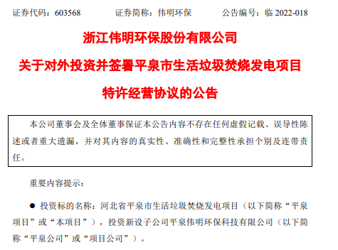 據(jù)悉,偉明環(huán)保作為聯(lián)合體牽頭人與上海寶達(dá)環(huán)境科技有限公司組成的聯(lián)合體于2022年1月被確認(rèn)為該項目的中標(biāo)社會資本。偉明環(huán)保負(fù)責(zé)投資、建設(shè)和運營平泉市生活垃圾焚燒發(fā)電特許經(jīng)營項目,公司以自有資金不超過 9,000 萬元投資于本項目。