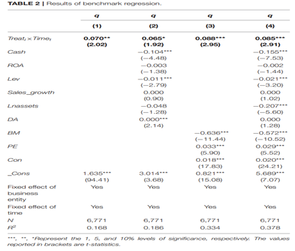 基準回歸結果如下表所示,由回歸結果可知,無論是否加入控制變量,核心解釋變量的系數(shù)均顯著為正,表明綠色金融試點政策顯著提升了試點地區(qū)綠色企業(yè)的長期價值。
