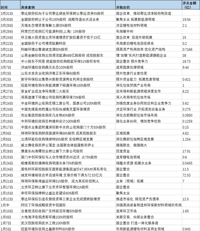 如泰達(dá)股份向子公司泰達(dá)綠色環(huán)保轉(zhuǎn)讓泰達(dá)潔凈5%股權(quán),就是為了推動泰達(dá)潔凈進(jìn)行股份制改造;皖能股份接盤控股股東安徽省能源集團(tuán)持有的安徽皖能環(huán)保發(fā)電有限公司51%股權(quán),是為了避免安徽能源集團(tuán)與皖能環(huán)保發(fā)電的同業(yè)競爭;武漢控股收購武水工程100%股權(quán),是想打造“投建管運(yùn)”一體化服務(wù)商,更好地滿足新時代的環(huán)境治理需求;城發(fā)環(huán)境吸并啟迪環(huán)境,則是為了實現(xiàn)國企間的戰(zhàn)略整合;而北京環(huán)境引入戰(zhàn)略投資者,據(jù)說是為了突破北京市場,更好地走向全國。而洪城環(huán)境、山東水發(fā)、深高速環(huán)境公司的收購,則主要是為了增強(qiáng)企業(yè)整體以及在固廢包括危廢領(lǐng)域的競爭優(yōu)勢。更多內(nèi)容見下表: