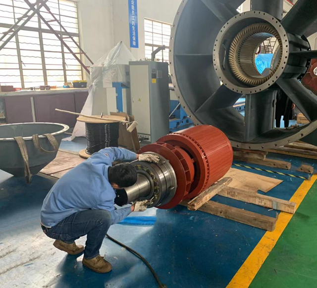 隨著工作人員進行運輸固定,首批2臺套高效高壓軸流潛水電機也即將交付。