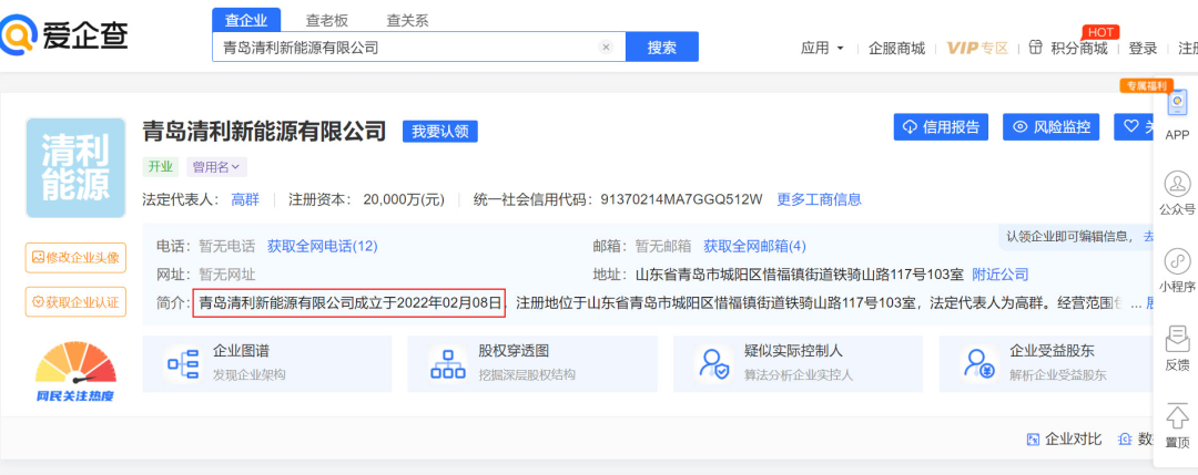 更有意思的是,清利新能源其實(shí)是一家非常年輕的公司,它的成立時(shí)間是“2022年2月8日”,直到現(xiàn)在還不足3個(gè)月時(shí)間。