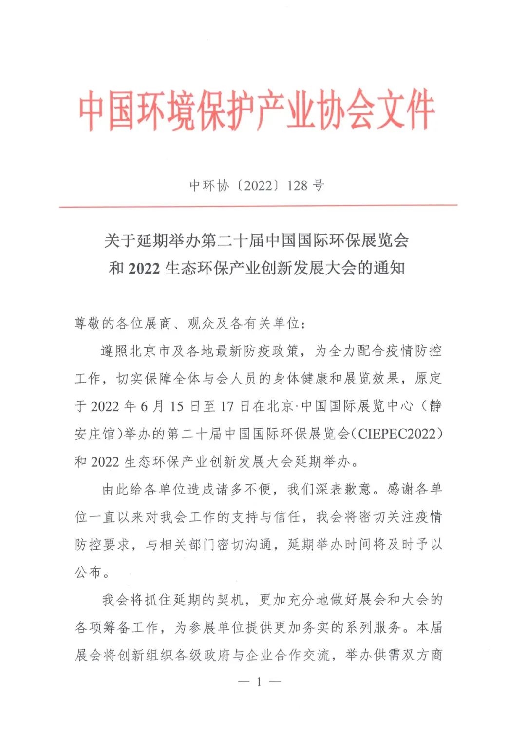 關(guān)于延期舉辦第二十屆中國國際環(huán)保展覽會和2022生態(tài)環(huán)保產(chǎn)業(yè)創(chuàng)新發(fā)展大會的通知