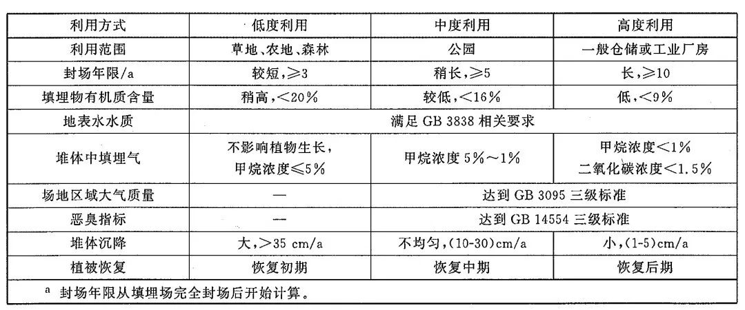 表3. GB/T 25179-2010《生活垃圾填埋場(chǎng)穩(wěn)定化場(chǎng)地利用技術(shù)要求》對(duì)填埋場(chǎng)場(chǎng)地穩(wěn)定化利用的判定要求