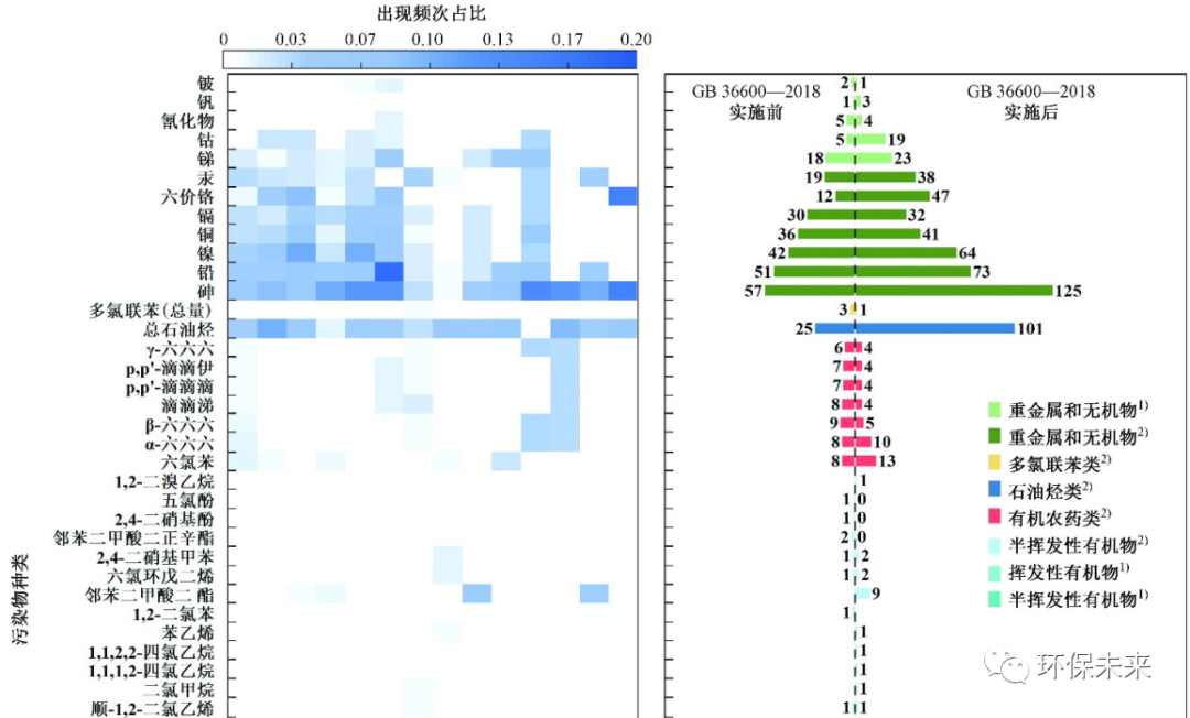c) GB 36600?2018《土壤環(huán)境質(zhì)量建設(shè)用地土壤污染風(fēng)險(xiǎn)管控標(biāo)準(zhǔn) (試行)》實(shí)施后,苯系物、多環(huán)芳烴類和總石油烴等典型污染物出現(xiàn)頻次的增幅較大,考慮到這些污染物危害性大、治理難度高,在以后的管理中需要高度關(guān)注. 有機(jī)農(nóng)藥類和多氯聯(lián)苯(總量) 的出現(xiàn)頻次有所減少. 根據(jù)我國農(nóng)藥污染場地的現(xiàn)狀及危害特性,建議對這類污染物的風(fēng)險(xiǎn)控制和管理應(yīng)予以充分關(guān)注.