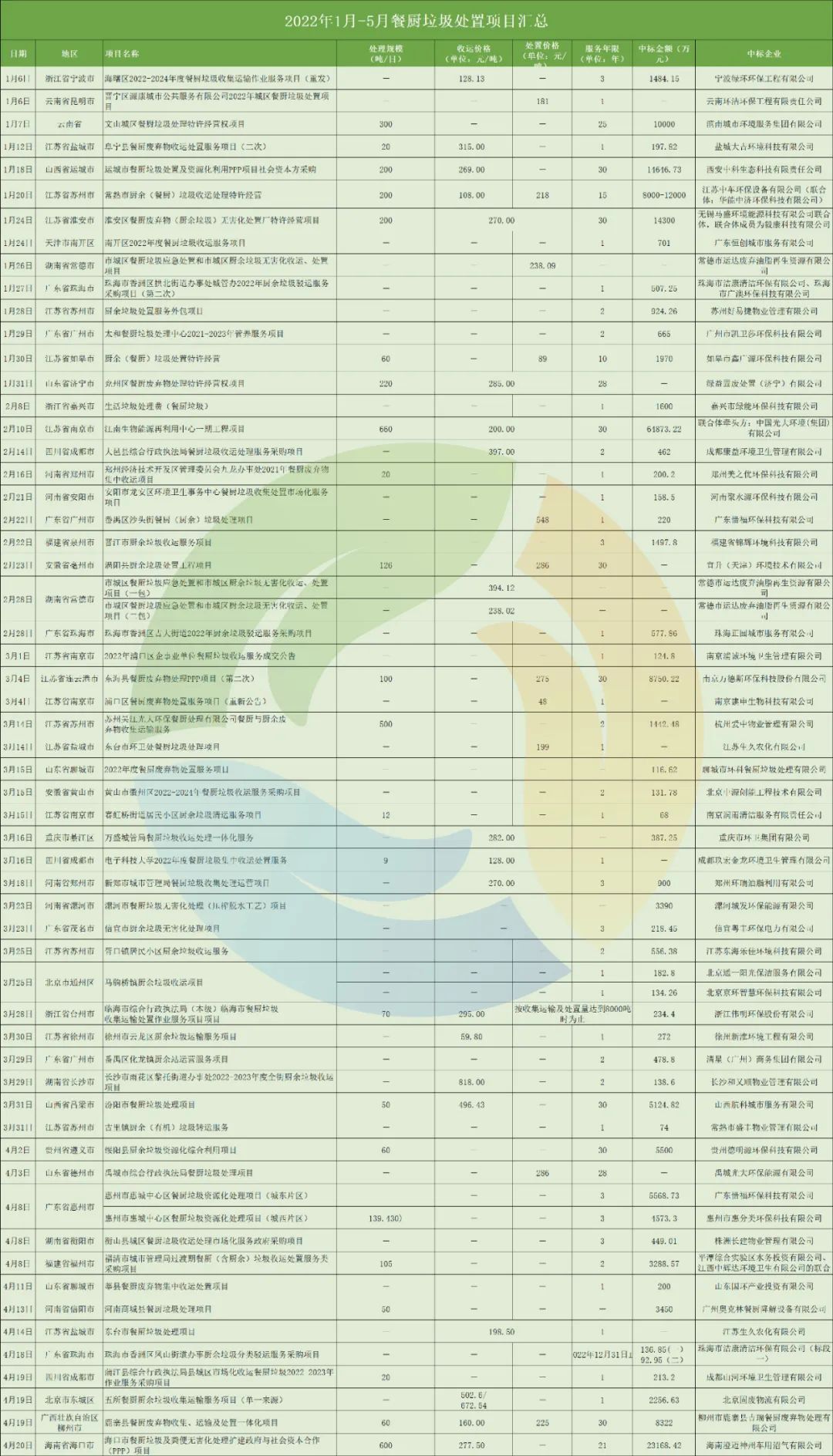 此外,在統(tǒng)計數(shù)據(jù)中,我們還可以發(fā)現(xiàn)本地國企中標趨勢明顯增強。例如,宜昌建投水務(wù)有限公司中標了1.6億的宜昌市廚余垃圾資源化處理特許經(jīng)營權(quán)項目,眉山市城投中恒能環(huán)保科技有限公司則中標了1.1億眉山市餐廚垃圾綜合利用項目。近年來,不少企業(yè)憑借自身優(yōu)勢與政府簽訂了餐廚垃圾/廚余垃圾項目單一來源采購協(xié)議。其中,北京固廢物流有限公司就以單一來源的方式拿下了2256萬的北京市東城區(qū)五所餐廚廚余垃圾收集運輸服務(wù)項目。這類項目最大特點就是只有一家供應(yīng)商,不存在競爭。不過,在2021年發(fā)布的97個餐廚/廚余垃圾項目中,有18個項目為單一來源方式,占比18.56%,其中多以收運處理一體化項目為主。今年單一來源方式采購項目明顯減少。而隨著垃圾焚燒項目“降溫”,龍頭企業(yè)布局餐廚垃圾市場的步伐也逐漸加快。2022年1-5月,光大環(huán)境共中標3個餐廚垃圾處理項目,拿標數(shù)量位居中標企業(yè)第一位,項目總預(yù)算金額超6億元(2021年同期,光大環(huán)境拿下3個項目,拿標數(shù)量位居中標企業(yè)第一位)。從不久前發(fā)布的2021年光大環(huán)境年報中可以看出,餐廚垃圾處理項目為光大環(huán)境凈利潤增長助力不少。而作為環(huán)衛(wèi)市場老牌企業(yè)的盈峰環(huán)境,2019開始切入餐廚市場。去年,盈峰環(huán)境全資子公司廣東盈峰環(huán)境投資有限公司中標淮安餐廚擴建項目,該擴建項目建成后,合同總額預(yù)計73612萬元(含收轉(zhuǎn)運合同總額33236萬元)。今年,盈峰環(huán)境又拿下了2個餐廚項目,分別位于湖南、安徽、廣東三省,服務(wù)范圍已從前端環(huán)衛(wèi)項目運營到末端的餐廚垃圾處置,成為跨界經(jīng)營的典范。還有長期從事垃圾滲濾液相關(guān)裝備制造和運營業(yè)務(wù)的萬德斯,2021年計劃以2.36億的價格收購時代桃源,切入有機垃圾領(lǐng)域(后停止收購)。今年取得了江蘇省連云港市東海縣餐廚廢棄物處理PPP項目,處置規(guī)模為100噸/日。值得注意的是,北清環(huán)能在最近一年內(nèi)累計花費8億元大規(guī)模收購餐廚項目,業(yè)務(wù)呈快速發(fā)展態(tài)勢。總體來看,我國餐廚垃圾處理行業(yè)雖然發(fā)展10年有余,但始終發(fā)展緩慢,項目和企業(yè)規(guī)模都比較小,競爭格局較為分散,目前尚沒有巨頭出現(xiàn)。不過,隨著市場逐漸釋放,單體項目的規(guī)模越來越大,未來,餐廚垃圾處理市場的巨頭或許也即將出現(xiàn),此次寶安項目可能就是轉(zhuǎn)折點。有人毛利27%,有人虧損