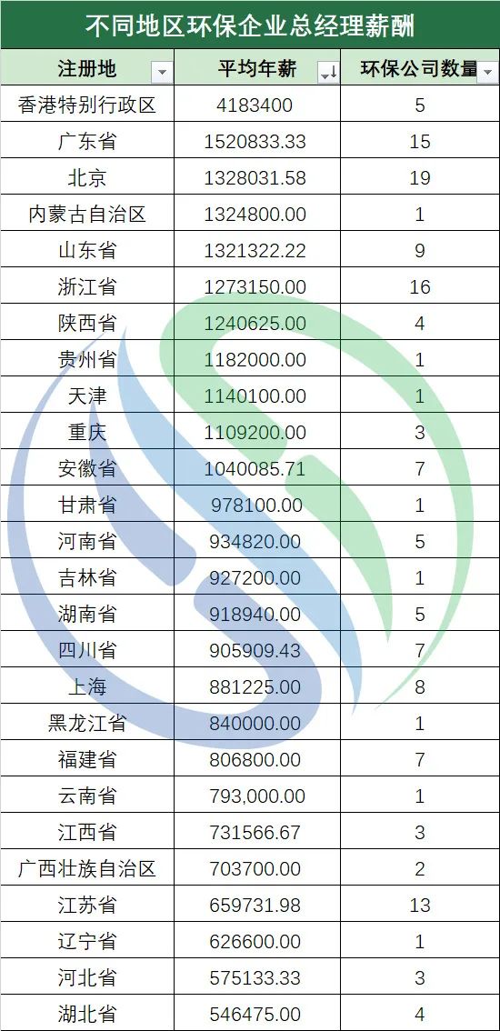 再從企業(yè)注冊地方面來看,中國水網(wǎng)所統(tǒng)計的143家環(huán)保上市公司分別來自26個省、市、自治區(qū)和特別行政區(qū)。其中,注冊地位于香港的環(huán)保上市公司總經(jīng)理平均年薪約為418.34萬元,遠(yuǎn)高于其它地區(qū),奪得地區(qū)冠軍。廣東、北京緊隨其后,分別以152.08萬元與132.8萬元位列第二、三名。