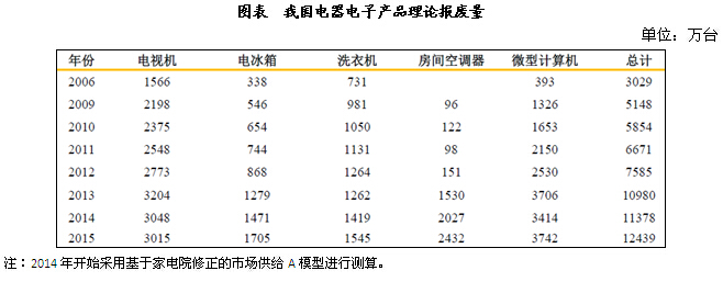 據商務部發(fā)布的《中國再生資源回收行業(yè)發(fā)展報告(2016)》顯示,2015年,我國五種主要廢棄電器電子產品的回收量約為15274萬臺,約合348萬噸。其中廢電視機回收量為5850萬臺;廢電冰箱回收量為1705萬臺;廢洗衣機回收量為1545萬臺;廢房間空調器回收量為2432萬臺;廢微型計算機回收量為3742萬臺。