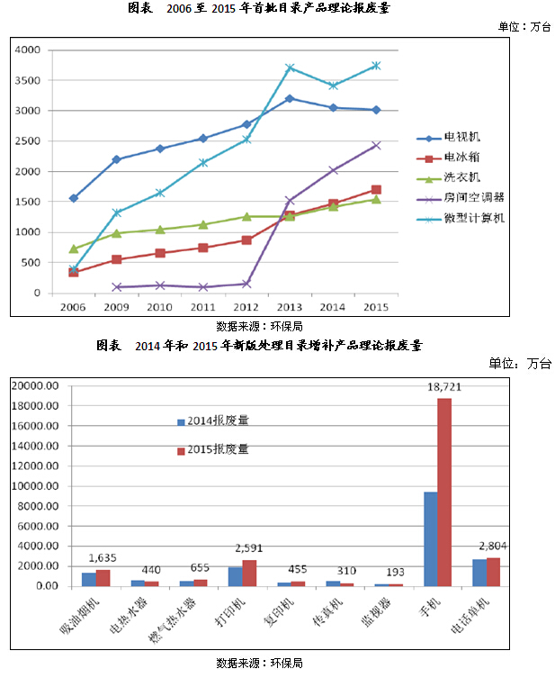 2015年首批目錄產品的理論報廢量增幅放緩,同比增加9.32%。在政策激勵下,從2013年開始,電冰箱、洗衣機、房間空調器和微型計算機的理論報廢量逐年上漲,但電視機的理論報廢量小幅下降。2015年,新增目錄產品中手機的理論報廢量同比增加約50%。