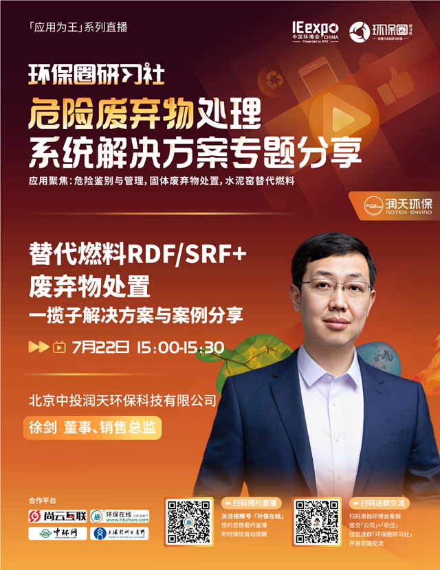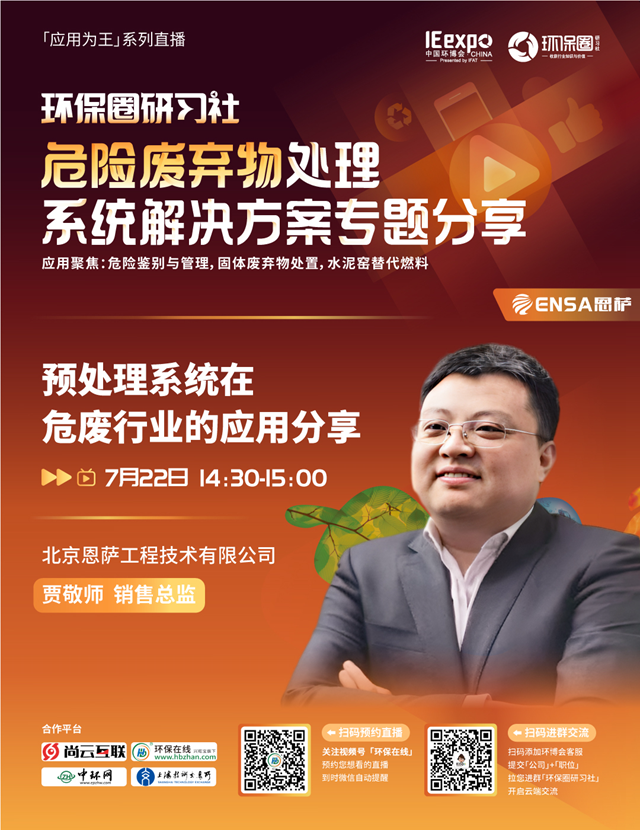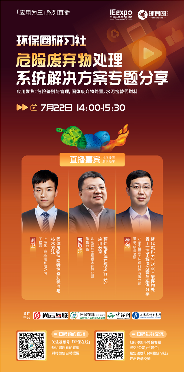 7月22日(星期五)下午14:00-15:30,環(huán)保圈研習(xí)社“應(yīng)用為王”系列直播,危險廢棄物處理系統(tǒng)解決方案專題分享,我們有幸邀請到了上?;ぴ?、北京恩薩、潤天環(huán)保3家企業(yè)的技術(shù)專家做客直播間,與我們共同探討危險廢棄物的鑒別與管理,危廢焚燒預(yù)處理,水泥窯協(xié)同處置等技術(shù)及相關(guān)解決方案。