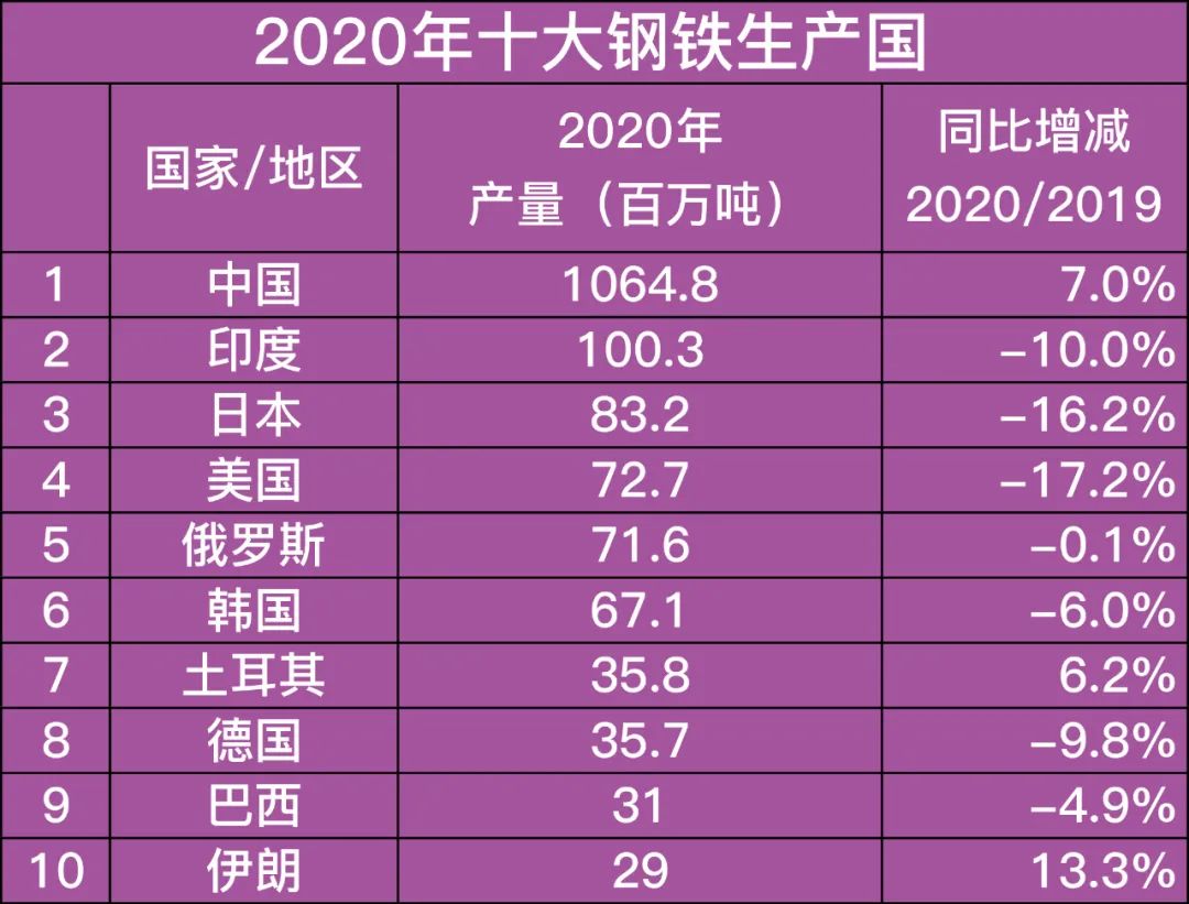 2020年全球主要鋼鐵生產(chǎn)國(guó)粗鋼產(chǎn)量排行榜  中商產(chǎn)業(yè)研究院