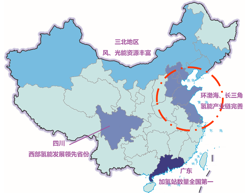 中國(guó)目前雖然是世界第一大產(chǎn)氫國(guó),但各地氫能資源配置并不相同:能穩(wěn)定制取綠氫的風(fēng)、光電在三北地區(qū),水電在西南地區(qū);工業(yè)副產(chǎn)制氫零散遍布;而氫能產(chǎn)業(yè)基地集中在中東南地區(qū)。