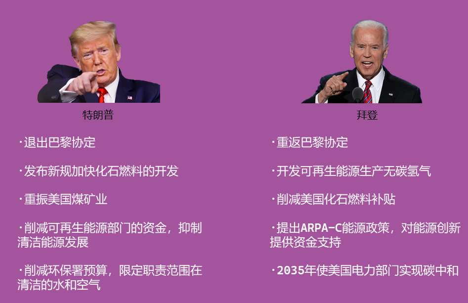 美國(guó)是“反復(fù)橫跳派”代表。一朝天子一朝臣的特色下,在國(guó)際上:反復(fù)“退群”氣候協(xié)定。在其國(guó)內(nèi):利好新能源的政策和利好化石能源的政策頻繁“兩極反轉(zhuǎn)”,地區(qū)和企業(yè)之間互相拉幫結(jié)派,整個(gè)能源產(chǎn)業(yè)難以協(xié)同作戰(zhàn)。