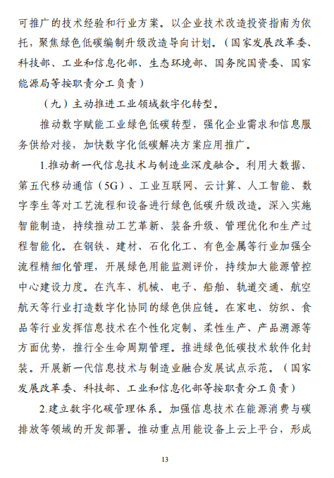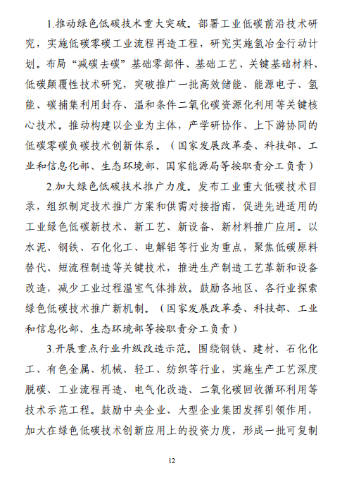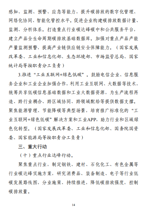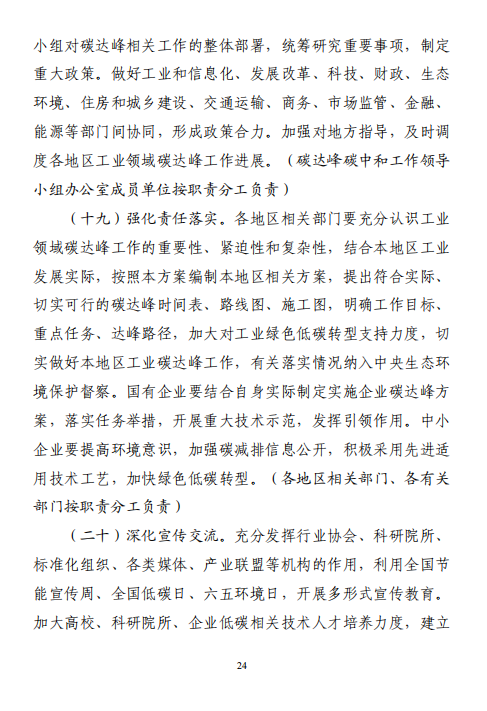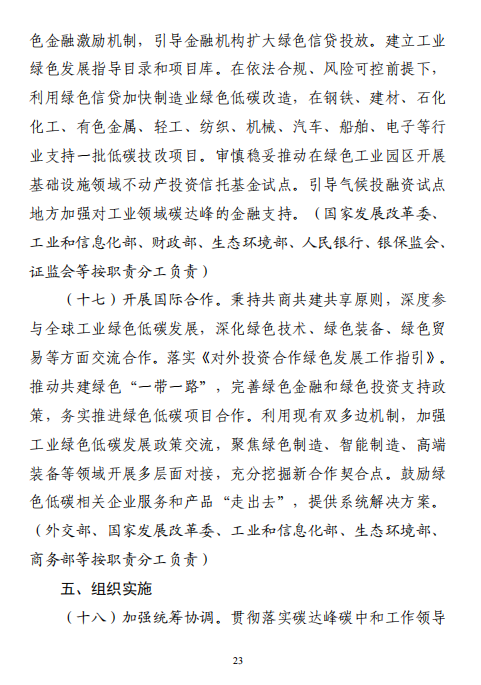 工業(yè)和信息化部 國家發(fā)展改革委 生態(tài)環(huán)境部關(guān)于印發(fā)工業(yè)領(lǐng)域碳達峰實施方案的通知工信部聯(lián)節(jié)〔2022〕88號外交部、科技部、司法部、財政部、住房城鄉(xiāng)建設(shè)部、交通運輸部、商務(wù)部、人民銀行、國資委、稅務(wù)總局、市場監(jiān)管總局、統(tǒng)計局、銀保監(jiān)會、證監(jiān)會、能源局、林草局、郵政局,各省、自治區(qū)、直轄市及計劃單列市、新疆生產(chǎn)建設(shè)兵團工業(yè)和信息化主管部門、發(fā)展改革委、生態(tài)環(huán)境廳(局):《工業(yè)領(lǐng)域碳達峰實施方案》已經(jīng)碳達峰碳中和工作領(lǐng)導(dǎo)小組審議通過,現(xiàn)印發(fā)給你們,請認真貫徹落實。