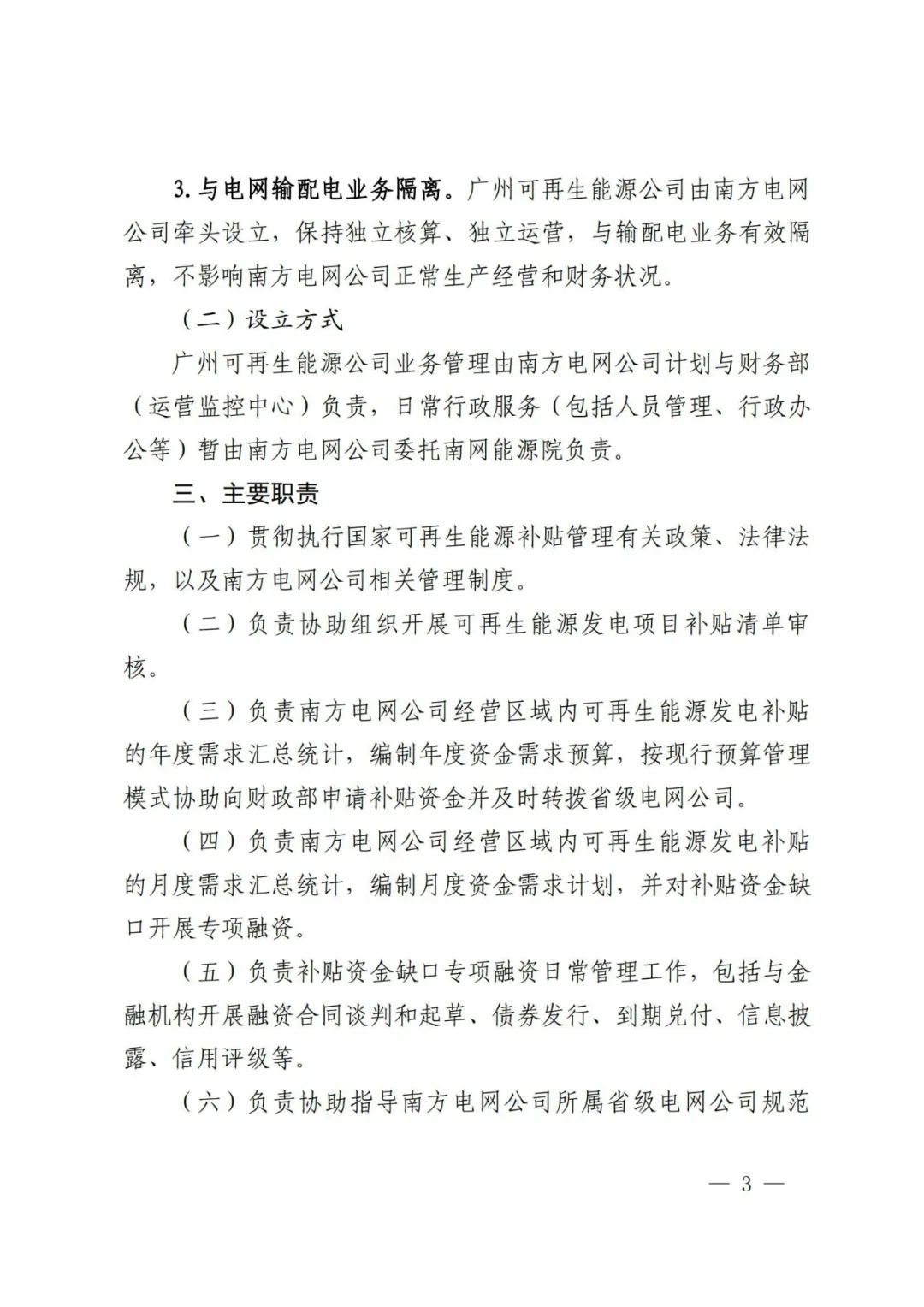 文件明確,廣州可再生能源公司主要職責(zé)包括負(fù)責(zé)南方電網(wǎng)公司經(jīng)營(yíng)區(qū)域內(nèi)可再生能源發(fā)電補(bǔ)貼的月度需求匯總統(tǒng)計(jì),編制月度資金需求計(jì)劃,并對(duì)補(bǔ)貼資金缺口開(kāi)展專(zhuān)項(xiàng)融資。負(fù)責(zé)補(bǔ)貼資金缺口專(zhuān)項(xiàng)融資日常管理工作,包括與金融機(jī)構(gòu)開(kāi)展融資合同談判和起草、債券發(fā)行、到期兌付、信息披露、信用評(píng)級(jí)等。以及開(kāi)展可再生能源發(fā)電項(xiàng)目補(bǔ)貼清單審核、年度需求匯總統(tǒng)計(jì)、編制年度資金需求預(yù)算,協(xié)助向財(cái)政部申請(qǐng)補(bǔ)貼資金、落實(shí)補(bǔ)貼的監(jiān)督核查等等。
