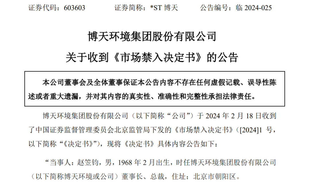 2月19日,博天環(huán)境公告稱,公司于2月18日收到北京證監(jiān)局下發(fā)的《市場(chǎng)禁入決定書(shū)》,認(rèn)定博天環(huán)境2017年、2018年、2019年、2020年、2021年年度報(bào)告存在虛假記載,構(gòu)成《證券法》所述的信息披露違法行為。
